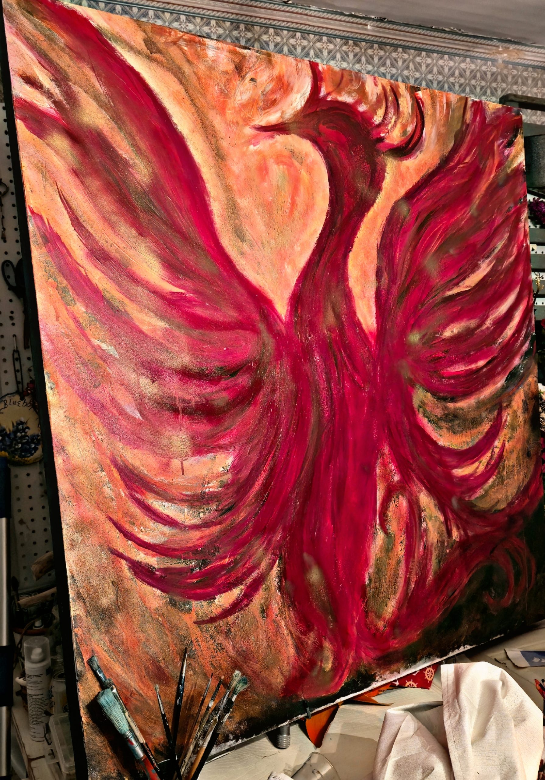 This piece emerged over two intense days between Decloaking and Engaging, when buried trauma surfaced, demanding both release and integration. Each brushstroke became a dialogue with the unspoken—layer upon layer of fiery reds and golds rising against the darkness. The Phoenix is not just a symbol; it is the embodiment of I AM becoming—the moment of burning away old narratives to make space for truth. This painting was both catharsis and reclamation, a living witness to what happens when I choose to meet mySelf fully. It is still in progress…